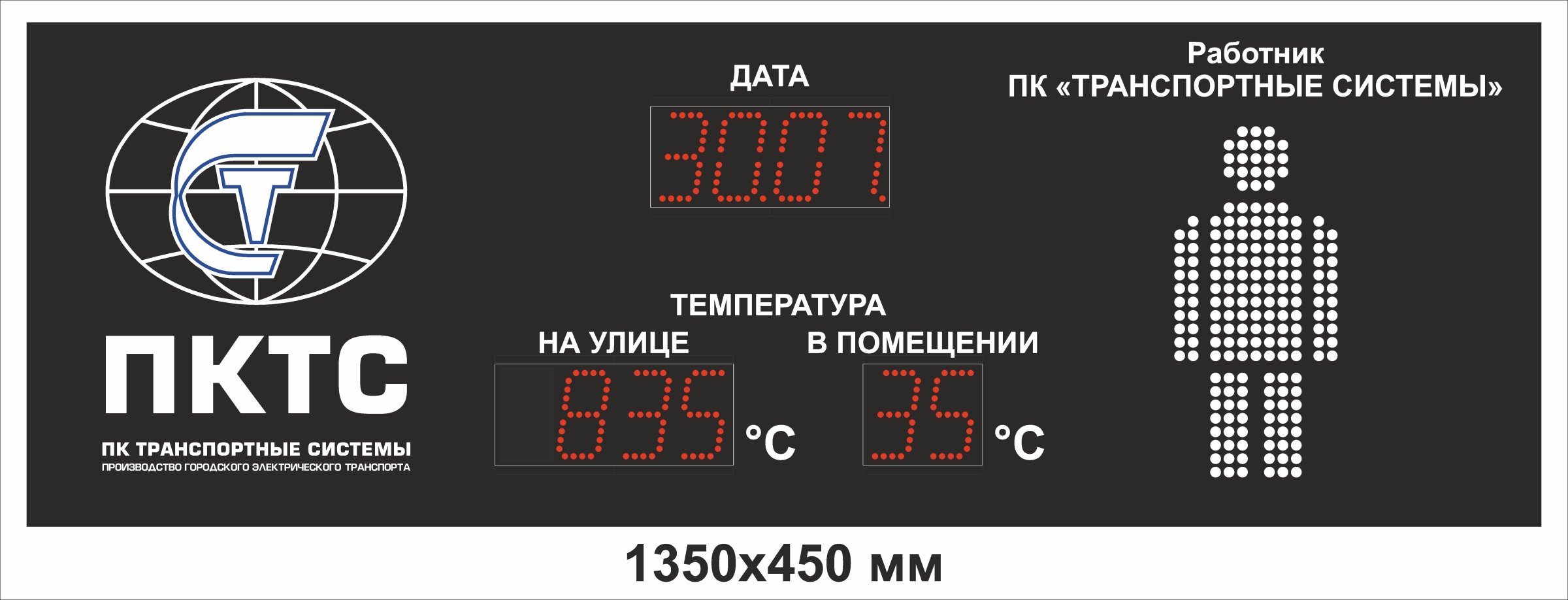 Электронное табло размером 1350x450 мм предназначено для отображения важной информации в реальном времени, включая дату, температуру в помещении и на улице, а также счетчик. Оно идеально подходит для использования в производственных и общественных местах, где необходимо оперативно информировать сотрудников и посетителей.Дисплей